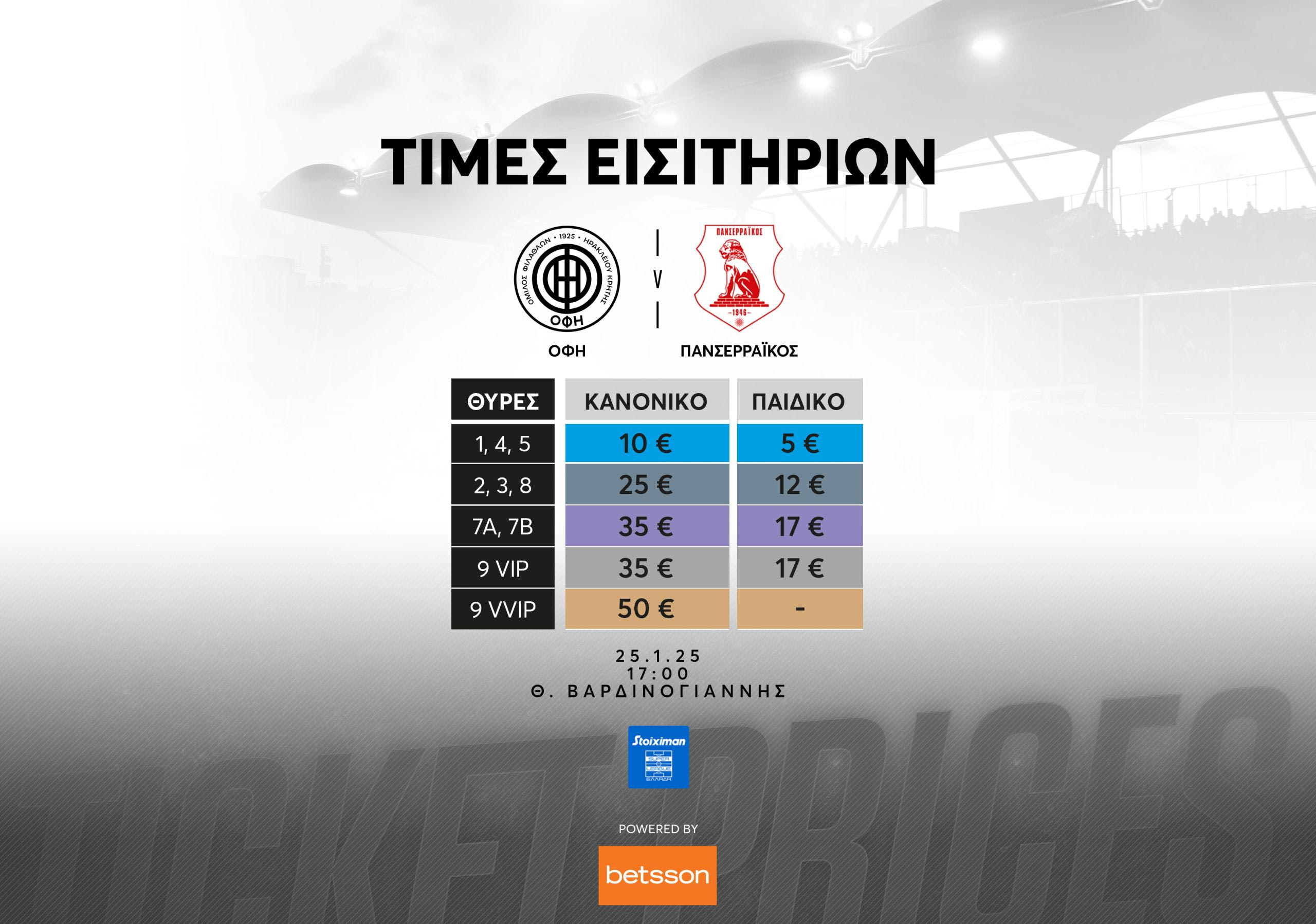 Τέθηκαν σε κυκλοφορία τα εισιτήρια του αγώνα του ΟΦΗ με τον Πανσερραϊκό (Σάββατο 25/01, 17:00, «Θεόδωρος Βαρδινογιάννης»), για την 20η αγωνιστική της Super League.