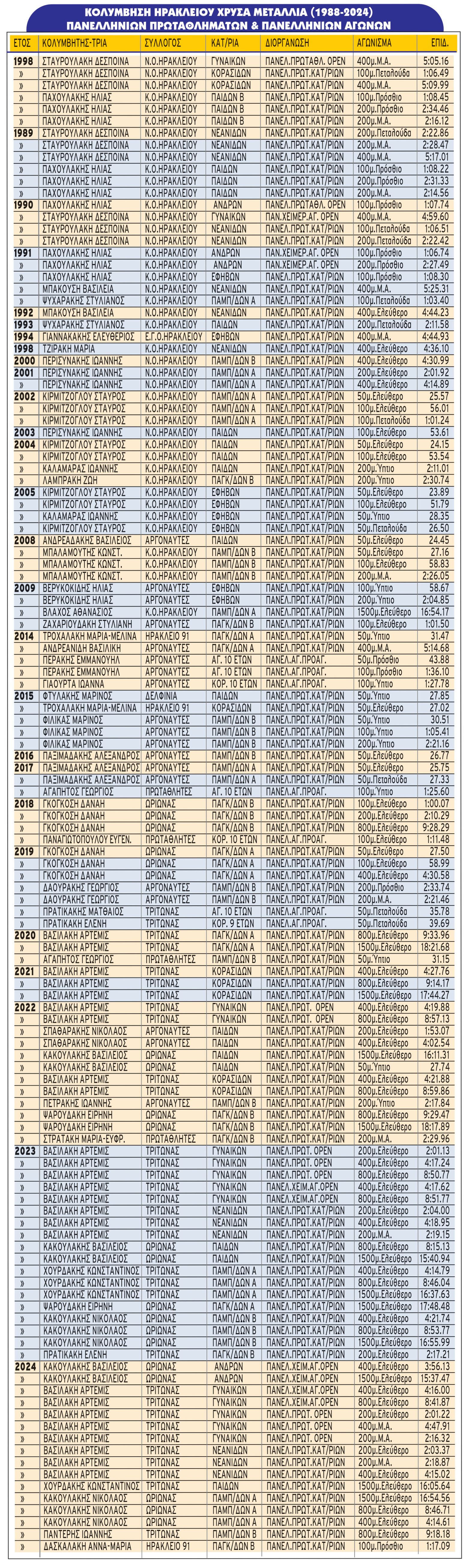 Γι’ αυτό σήμερα και για πρώτη φορά η “Π” παρουσιάζει έναν ιστορικό πίνακα με τις χρυσές επιτυχίες των Ηρακλειωτών αθληών-τριών από το 1988 έως σήμερα. Οι διακρίσεις, όπως μας ενημέρωσε ο κ. Χάρμπας αφορούν αθλητές-τριες που τη στιγμή που πέτυχαν τη διάκριση φορούσαν σκουφάκι συλλόγου Ηρακλείου.