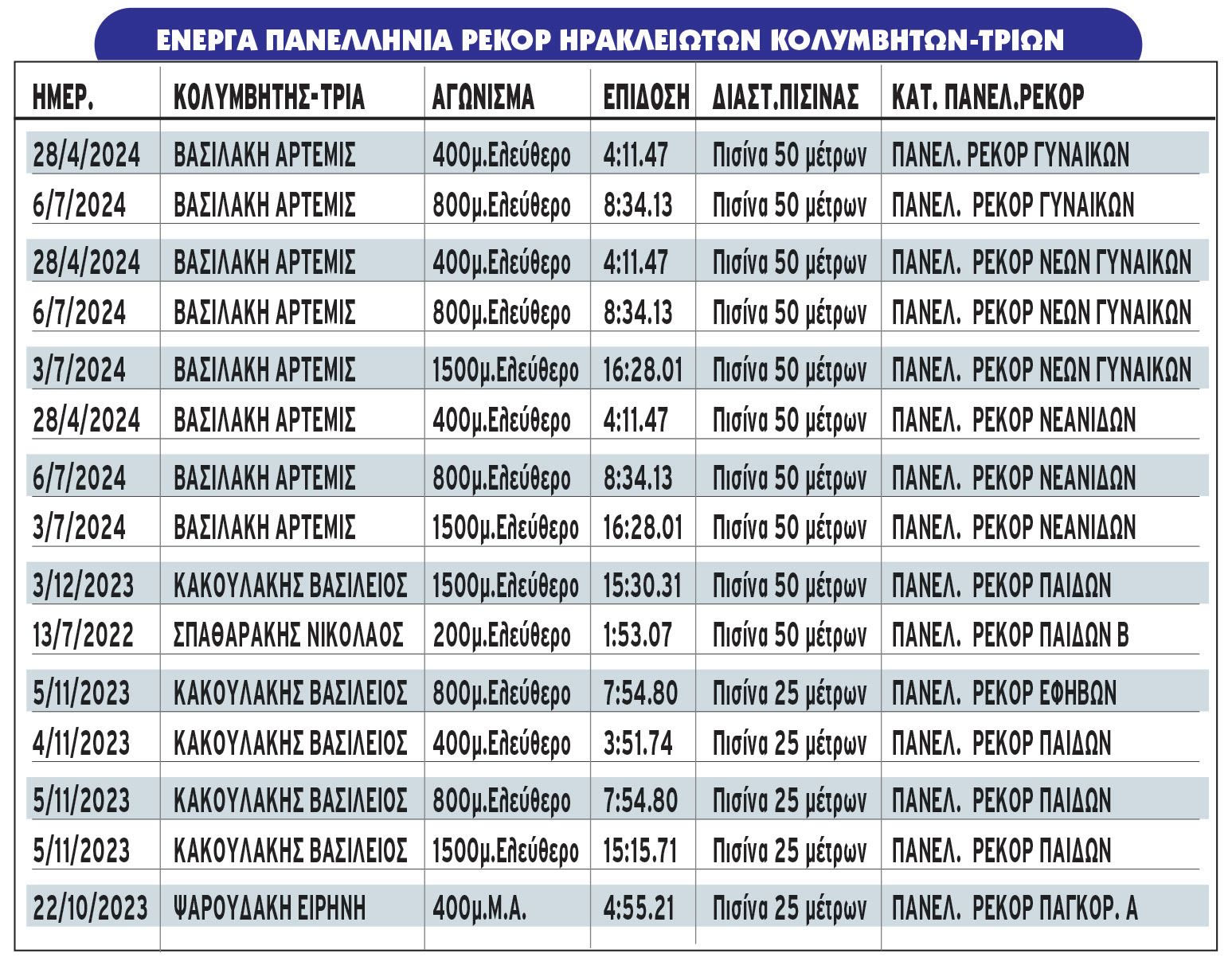 Η περυσινή χρονιά ήταν από τις καλύτερες ιστορικά για την Ηρακλειώτικη πισίνα. Κατέγραψε πολλά μετάλλια σε Πανελλήνιους αγώνες, διακρίσεις, σε Πανευρωπαϊκούς, Μεσογειακούς αγώνες ενώ στην ανοιχτή κολύμβηση δηλαδή στην ανοιχτή θάλασσα, είχαμε ρεκόρ και παγκόσμιες επιδόσεις δείχνοντας ότι το Ο.W. ταιριάζει στους Ηρακλειώτες.