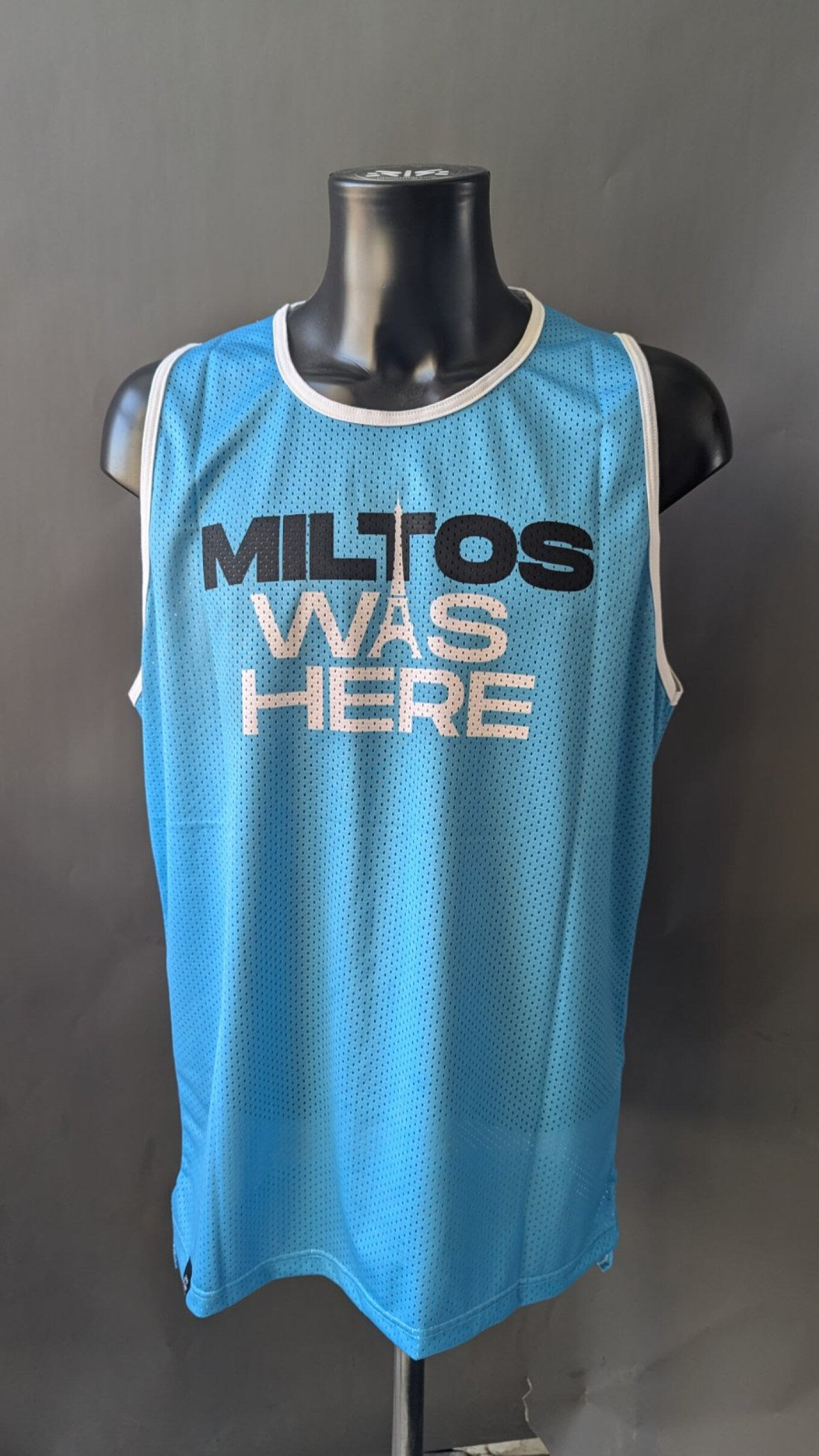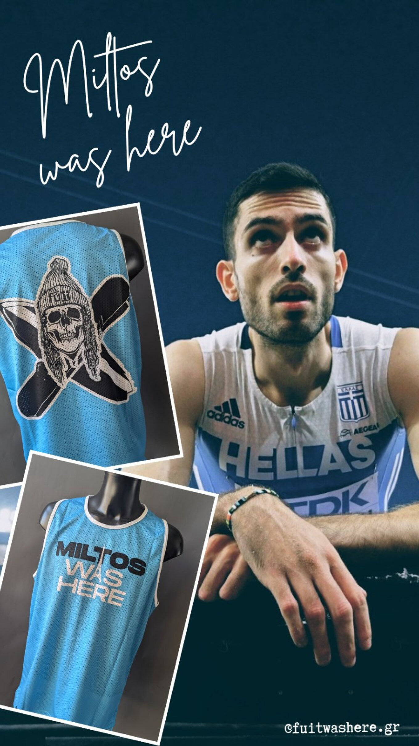 Στο μπλουζάκι υπάρχει σχέδιο του Πύργου του Άιφελ και τρεις λέξεις: Miltos was here. Από που προκύπτει αυτό το σλόγκαν; Από τον εμπνευστή και δημιουργό της σειράς ρούχων «fuit was here» που είναι ο Γιάννης Ευαγγελόπουλος, ο οποίος διατηρούσε επί χρόνια αρτ καφέ στα Γρεβενά στο οποίο σύχναζε ο Τεντόγλου και τα μέλη της οικογένειάς του.