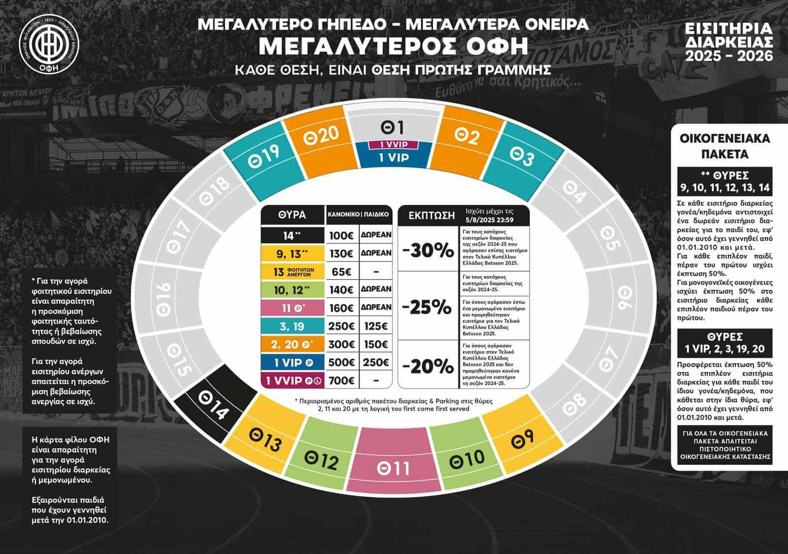Τα εισιτήρια διαρκείας της σεζόν 2025–26, που προσφέρουν εξαιρετική θέαση στις δύο ευθείες του Παγκρητίου Σταδίου, καλύπτουν όλους τους εντός έδρας αγώνες σε πρωτάθλημα, κύπελλο και φιλικές αναμετρήσεις.