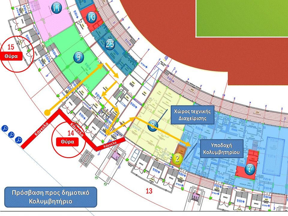 iv. Η πρόσβαση στο κολυμβητήριο θα γίνεται μέσω διαδρομής που θα δημιουργηθεί – εσωτερικά ή και εξωτερικά – από την θύρα 14 προς την θύρα 13 μέσω του χώρου τεχνικής διαχείρισης. Τα οχήματα των χρηστών του κολυμβητηρίου θα σταθμεύουν μέχρι την θύρα 14 στην οποία θα δημιουργηθούν και θέσεις ΑΜΕΑ.
