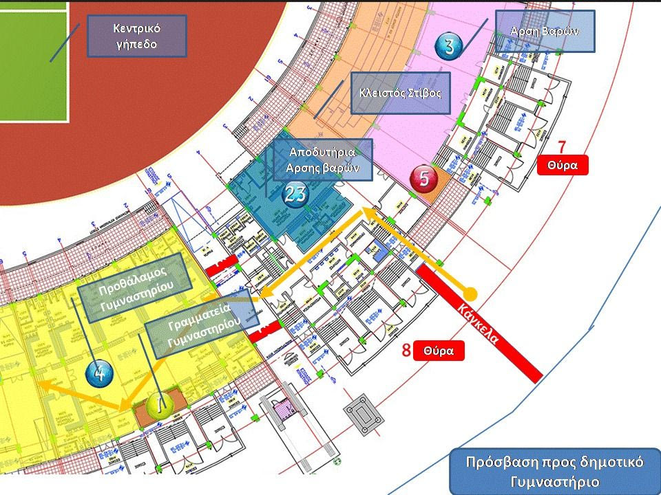 ii. Η πρόσβαση στο δημοτικό γυμναστήριο του σταδίου θα γίνεται από την θύρα 8 – ανεμοφράκτη εισόδου διαδρόμου ΑΜΕΑ- και μέσω την εισόδου της πύλης οχημάτων (θύρα 9).