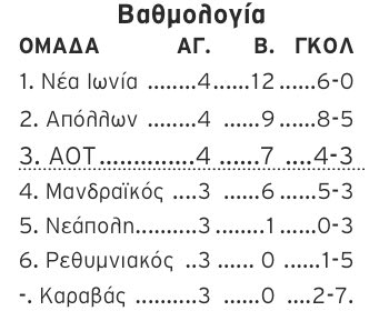 Ό,τι κι αν γίνει στην αυριανή 5η αγωνιστική ο ΑΟΤ κρατάει την τύχη στα χέρια του αφού με δυο νίκες στα ισάριθμα παιχνίδια που ακολουθούν στο Τυμπάκι με Ρεθυμνιακό και Μανδραϊκό θα είναι σίγουρα στην τριάδα ανόδου. Πλέον η ομάδα του Νίκου Σουτζή έχει όλο το χρονικό περιθώριο να προετοιμαστεί αγωνιστικά αλλά και ψυχολογικά για αυτά τα παιχνίδια που θα διεξαχθούν στις 26 Μαίου και στις 2 Ιουνίου και θα κρίνουν τον μεγάλο στόχο της επανόδου στην Γ΄ Εθνική μετά από μια χρονιά απουσίας.