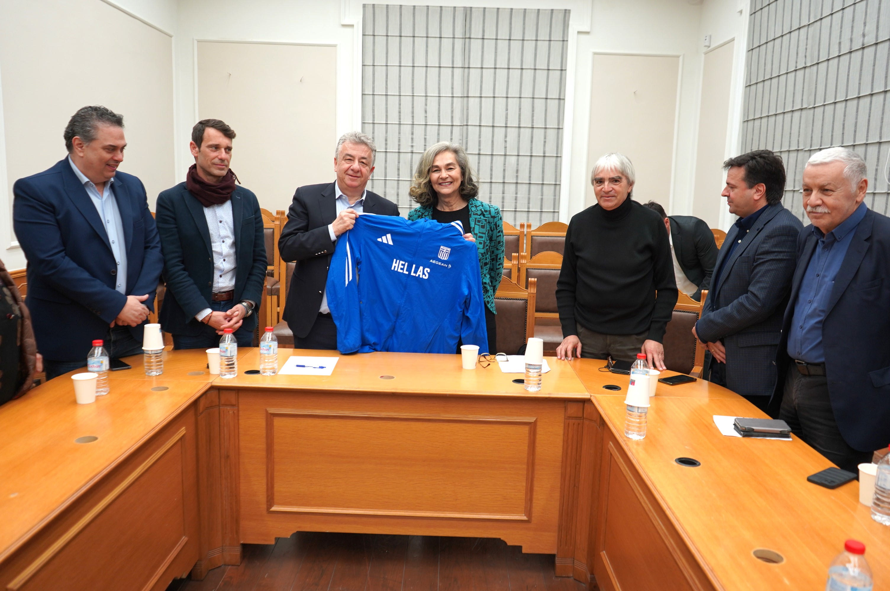 Στο τέλος της ευρείας σύσκεψης η κα. Σακοράφα δώρισε στον Περιφερειάρχη την επίσημη ενδυμασία της Εθνικής ομάδας Στίβου όπου σήμερα ξεκινά την προσπάθεια της στο Παγκόσμιο Πρωτάθλημα Κλειστού Στίβου στη Γλασκόβη.