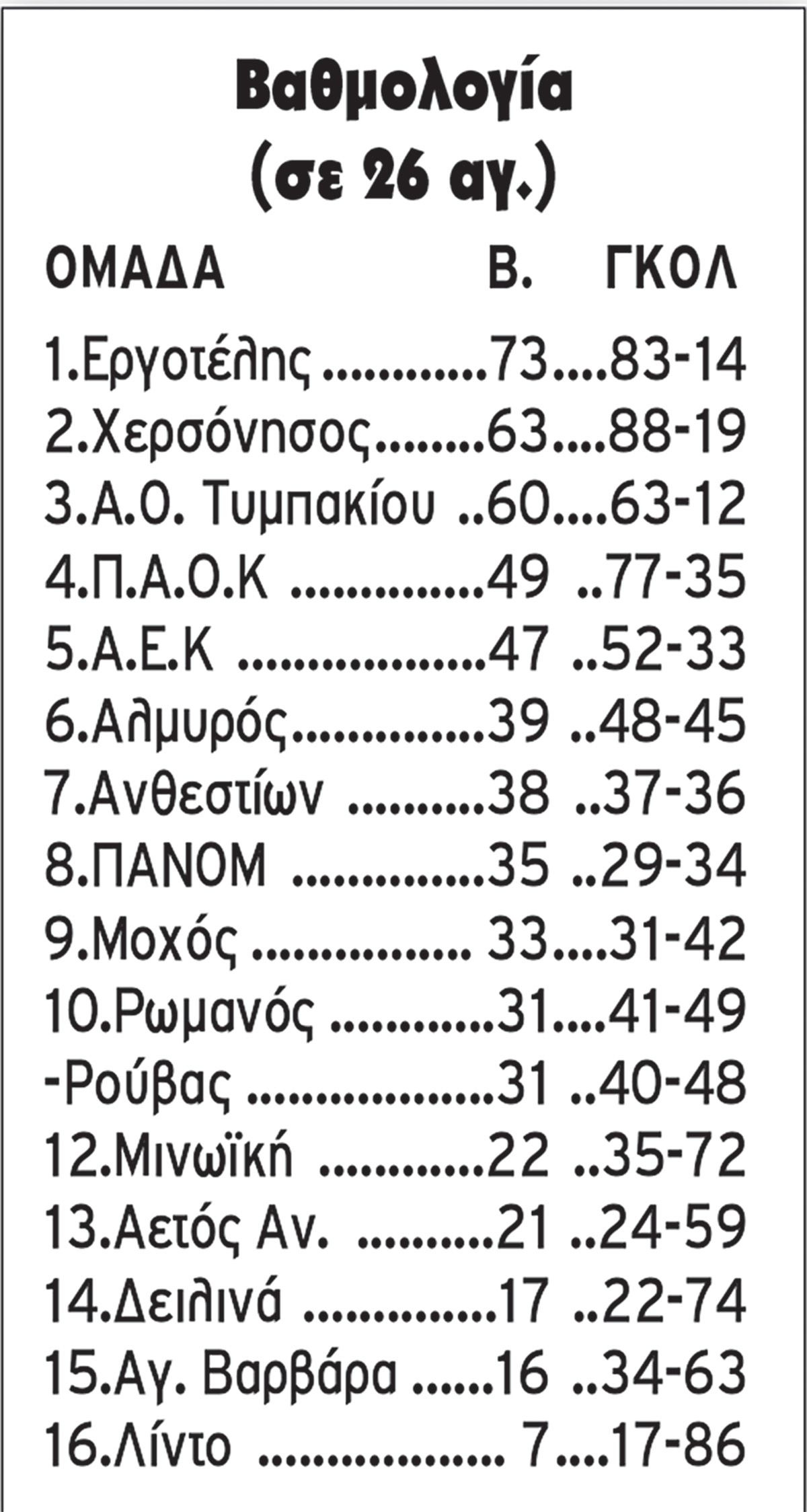 Την ίδια ώρα, ο Εργοτέλης είναι έτοιμος, εκτός από την επιστροφή του στην Γ΄ Εθνική, να πανηγυρίσει και την κατάκτηση του τίτλου. Βρίσκεται στο +10 από τη Χερσόνησο και χρειάζεται μια νίκη στα επόμενα τέσσερα ματς για να στεφθεί και τυπικά πρωταθλητής. Αντιμετωπίζει Αγία Βαρβάρα(εντός), Ρούβα(εκτός), Χερσόνησο(εντός) και Λίντο(εκτός).