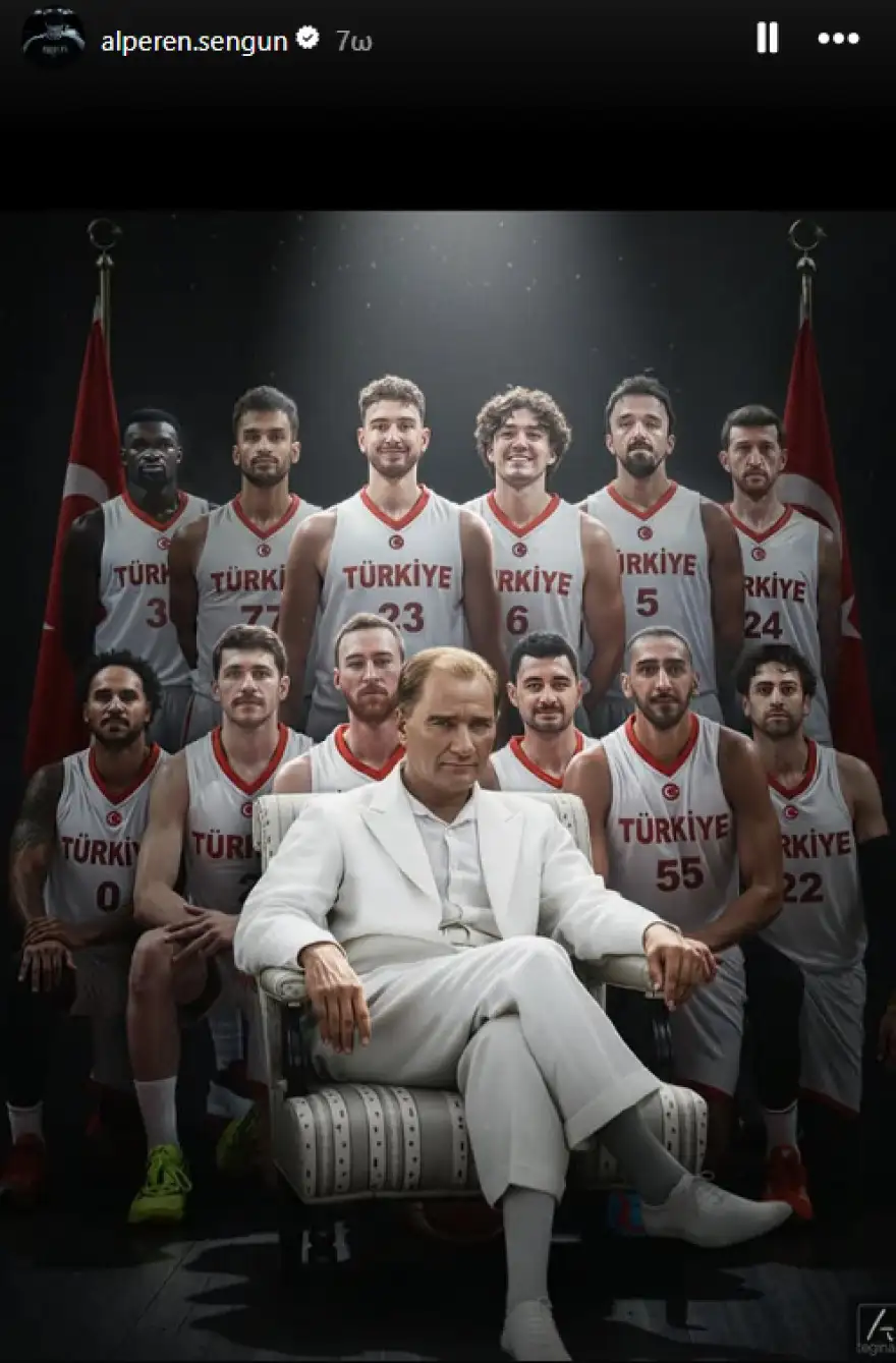 Αρχικά, ο άσος των Χιούστον Ρόκετς ανάρτησε μια AI φωτογραφία που δείχνει τον Κεμάλ σε μια καρέκλα και πίσω του όλους τους παίκτες της εθνικής ομάδας μπάσκετ της Τουρκίας.