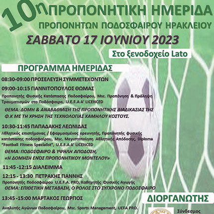 Ο Σύνδεσμος Προπονητών Ποδοσφαίρου Νομού Ηρακλείου με την υποστήριξη της Περιφέρειας Κρήτης ,του ΔΟΠΑΦΜΑΗ και της ΕΠΣΗ, διοργανώνει το ερχόμενο Σάββατο 17 Ιουνίου (9πμ-3μμ) στο ξενοδοχείο Lato, τη 10η προπονητική ημερίδα.