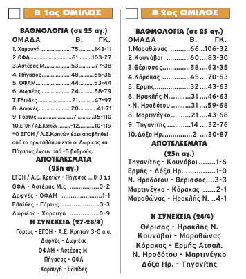 Χωρίς νικητή έληξαν οι αναμετρήσεις των Ελπίδων με την Γόρτυνα (3-3) και των Δαφνών με τον ΟΦΑΜ (1-1), που διεξήχθησαν στο ίδιο γήπεδο (Πανεπιστημίου / Περιφέρειας). Χωρίς να… ιδρώσει πήρε το εκτός έδρας τρίποντο (3-0 α.α.) ο Πήγασος, καθώς ο ΕΓΟΗ / Α.Ε. Κρητών έχει αποβληθεί από το πρωτάθλημα. «Κλείδωσε» την κατάκτηση του τίτλου στη Β2 ο Μαραθώνας μετά την 21η νίκη του στο πρωτάθλημα κι ενώ απομένουν δύο αγωνιστικές για την ολοκλήρωσή του.