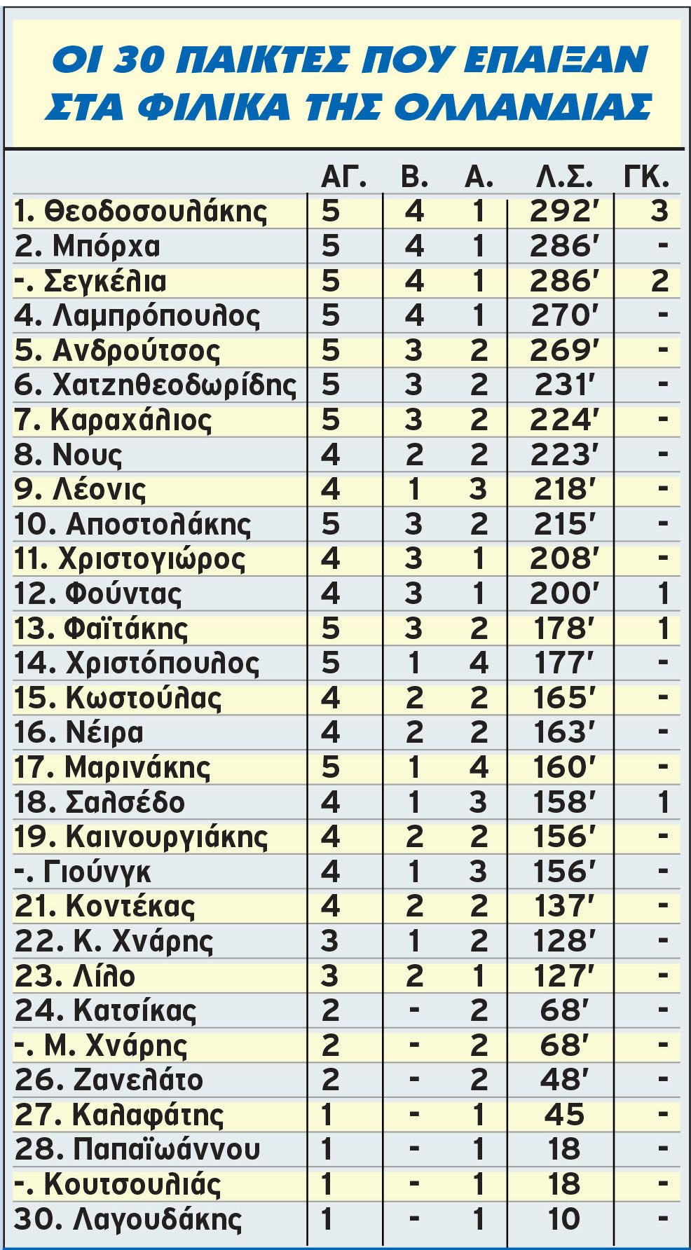 Ο Ράσταβατς στα πέντε φιλικά στην Ολλανδία χρησιμοποίησε συνολικά 30 ποδοσφαιριστές. Οι δυο που δεν πήραν καθόλου χρόνου είναι ο Μπαίνοβιτς που αναμένεται από Σεπτέμβριο και ο Ρακονιάτς που πήγε καθυστερημένα και δεν πρόλαβε. Αν δει κανείς πως μοίρασε τον χρόνο συμμετοχής ο τεχνικός του ΟΦΗ μπορεί να βγάλει συμπεράσματα για τις σκέψεις του.