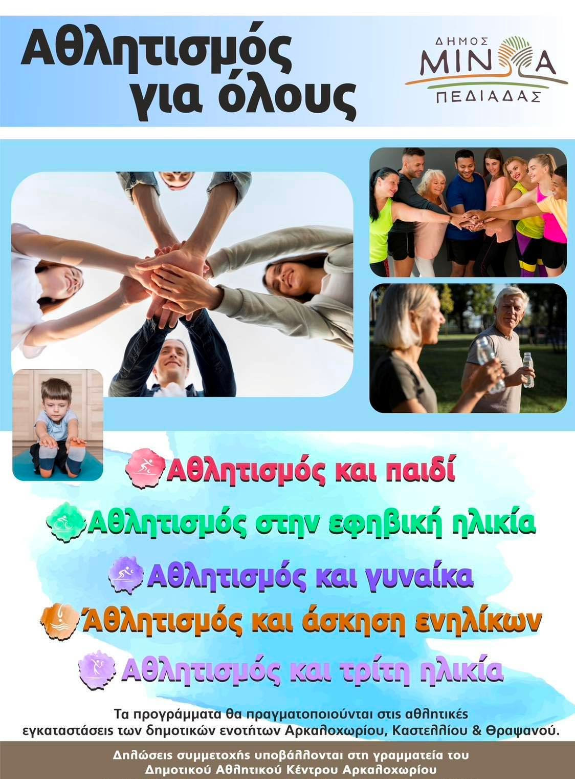 Ο Δήμος Μινώα Πεδιάδας, υπενθυμίζει στους δημότες ότι μπορούν να δηλώσουν συμμετοχή στο Πρόγραμμα «Αθλητισμός για Όλους».