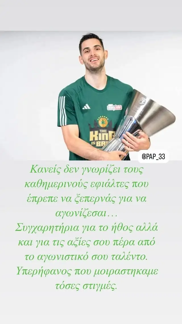 Ο αρχηγός του Παναθηναϊκού ανέβασε μια φωτογραφία του «Παπ» στην οποία ο ίδιος κρατάει το τρόπαιο της Euroleague, η οποία συνοδεύεται από το μήνυμα: