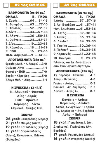 Για την ομάδα της Καλλιθέας (που βρίσκεται πλέον… αγκαλιά με την παραμονή) βρήκε δίχτυα ο Μπουλούκας και για το Λίντο ο Τρυφίδης. Ακόμα μία νίκη πανηγύρισε στον δεύτερο όμιλο της Α2, η πρωταθλήτρια ομάδα του Ασημίου στην 23η αγωνιστική. Οι Χατζάκης, Σαριδάκης, Ξαγοραράκης και Πρίφτης έβαλαν την… υπογραφή τους στο άνετο 4-0 επί του Κεραυνού. Στην έδρα της νίκησε και η Αγία Βαρβάρα τα Κανάρια με 4-2 με… σόου του Γιαλιτάκη, που πέτυχε και τα τέσσερα της γκολ! Για τους φιλοξενούμενους σκόραραν οι Ντολάνι και Βγόντζας.