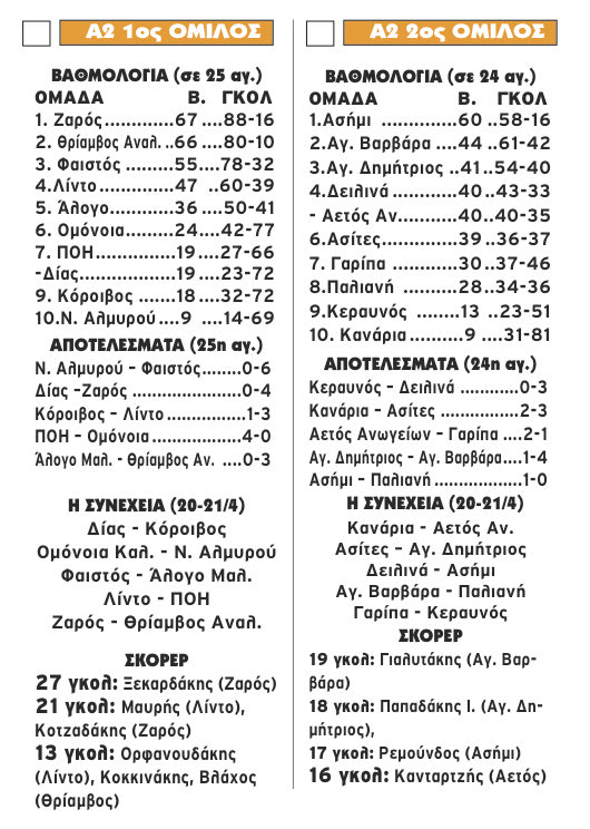 Mε αβαντάζ ενός βαθμού θα υποδεχθεί ο πρωτοπόρος Ζαρός τον Θρίαμβο Αναλήψεως στο ντέρμπι – τίτλου την επόμενη (προτελευταία) αγωνιστική, με τις δύο ομάδες να κερδίζουν εκτός έδρας στην 25η… στροφή του πρώτου ομίλου της Α2.
