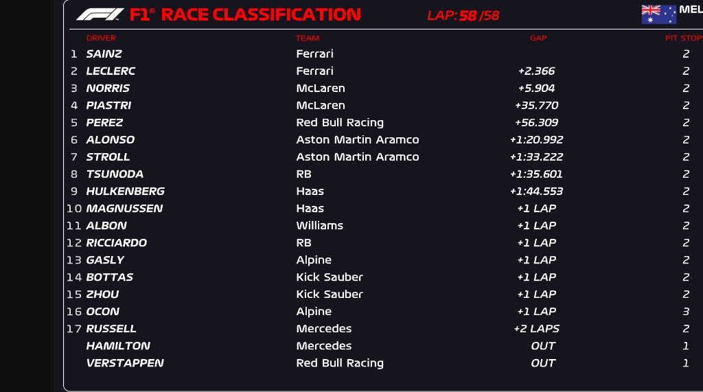 Η Ferrari θριάμβευσε εκμεταλλευόμενη και τις συγκυρίες κάνοντας το 1-2 στην Αυστραλία. Ο Κάρλος Σάινθ κατέκτησε τη νίκη με τον ομόσταβλό του, Σαρλ Λεκλέρ, να έρχεται δεύτερος, ενώ τρίτος ήταν ο Λάντο Νόρις παίρνοντας για πρώτη φορά φέτος θέση στο πόντιουμ. Ο Ισπανός, που είχε χάσει το προηγούμενο Grand Prix προ δύο εβδομάδων στη Σαουδική Αραβία λόγω επέμβαση σκωληκοειδίτιδας είναι ο μόνος άλλος πιλότος που έχει κερδίσει στους τελευταίους 21 αγώνες του πρωταθλήματος πέρα από τον Μαξ Φερστάπεν.