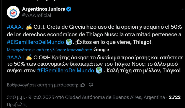Δείτε τι αναφέρει ακριβώς ο επίσημος λογαριασμός της Αρχεντίνος Τζούνιορς: