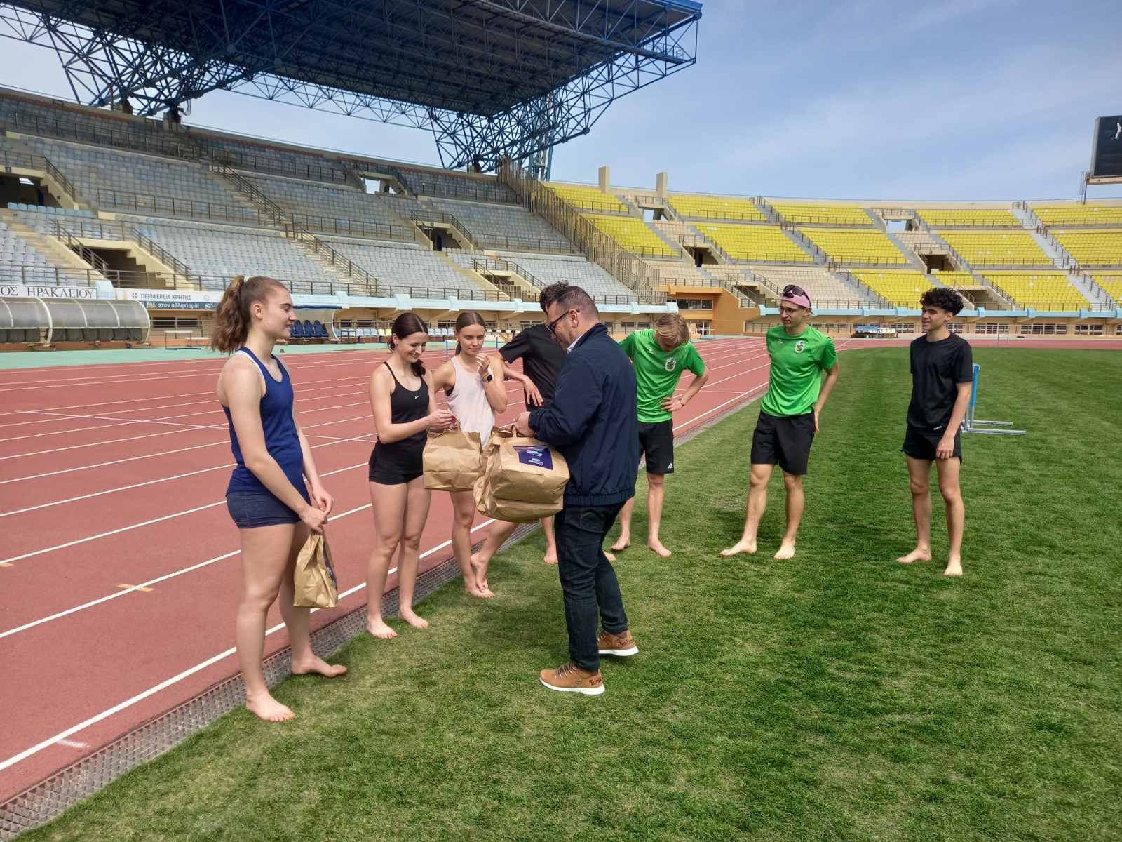 Ο Αντιδήμαρχος Αθλητισμού Γιάννης Τσαπάκης και ο Συντονιστής της εγκατάστα-σης του Παγκρητίου Σταδίου Δημήτρης Τσιράκος είχαν την ευκαιρία να μιλήσουν με τους αθλητές, ενώ εθιμοτυπικά πρόσφεραν στην ξένη αποστολή αναμνηστικά δώρα ευχαριστώντας τους για την επιλογή της πόλης μας ως μέρος της προετοιμασίας τους.
