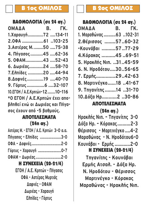 Ο Αστέρας Μυρτιάς πήρε το τρίποντο (3-0 α.α) χωρίς να… ιδρώσει, καθώς ο ΕΓΟΗ / Α.Ε. Κρητών έχει αποβληθεί από το πρωτάθλημα. «Αγκαλιά» με τον τίτλο στη Β2 βρίσκεται ο Μαραθώνας μετά τη νέα του νίκη την 24η αγωνιστική.