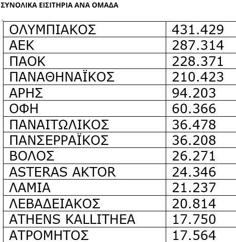 Ο Ολυμπιακός είχε τον καλύτερο μέσο όρο εισιτηρίων ανά αγώνα (26.964), ενώ ακολούθησε η ΑΕΚ (23.943), ο Παναθηναϊκός (16.186) και ο ΠΑΟΚ (14.273). Οι τέσσερις αυτές ομάδες είχαν επιδόσεις με πενταψήφιο μέσο όρο, ενώ ακολούθησε ο Άρης με 7.246 εισιτήρια ανά αγώνα.