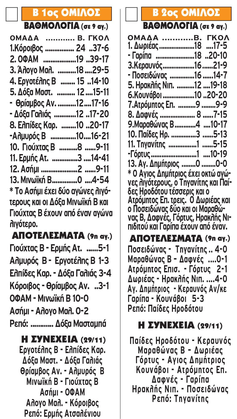 Στην τρίτη θέση παρέμεινε το Αλογο Μαλεβιζίου μετά το διπλό στο Ασήμι (2-0). Την πρώτη τετράδα «κλείνει» ο Εργοτέλης Β, που πέρασε νικηφόρα από το Γάζι με 3- 1 επί του Αλμυρού Β. Με το άνετο 5-1 κέρδισε ο Γιούχτας Β τον Ερμή Ατσαλένιου στο γήπεδο του Λίντο. Ματσάρα στο γήπεδο του «Πανεπιστημίου / Περιφέρειας» με την Δόξα Γαλιάς να επικρατεί με 4-3 των Ελπίδων Καρτερού.