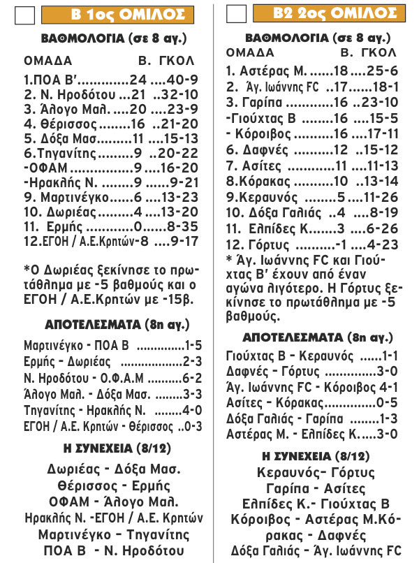 Ο Τηγανίτης επιβλήθηκε με 4-0 του Ηρακλή Νιπιδιτού στο Λίντο, ενώ ο Δωριέας «άλωσε» το Ατσαλένιο (3-2 τον Ερμή). «Αναψε» για τα καλά η «μάχη» του τίτλου στο πρωτάθλημα της Β2, αφού μετά τη διεξαγωγή της 8ης αγωνιστικής, την κούρσα οδηγεί ο φορμαρισμένος Αστέρας Μυρτιάς.