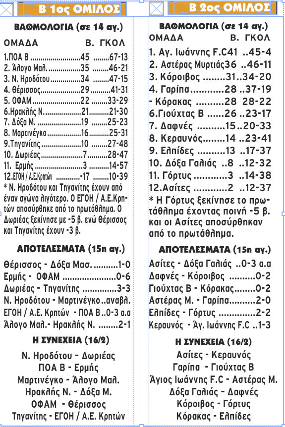 Στο +10 από τον δεύτερο της βαθμολογίας (Αλογο Μαλεβιζίου) βρίσκεται πλέον ο απόλυτος ΠΟΑ Β’ στη Β1 ΕΠΣΗ, ενώ ο επικεφαλής του δευτέρου ομίλου της Β’ κατηγορίας Αγιος Ιωάννης F.C επέκτεινε στις 10 νίκες το σερί του μετά την ολοκλήρωση της 15ης αγωνιστικής.