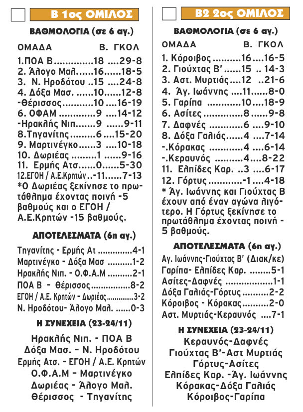 Μόνο ο ΠΟΑ Β’ συνεχίζει πλέον με το απόλυτο των νικών (6/6) στην Β1 ΕΠΣΗ, ενώ στην Β2 ΕΠΣΗ ο Κόροιβος πέρασε στην πρώτη θέση, αφού ο αγώνας του απόλυτου Γιούχτα Β με τον Άγιο Ιωάννη FC δεν ολοκληρώθηκε λόγω της κακοκαιρίας.