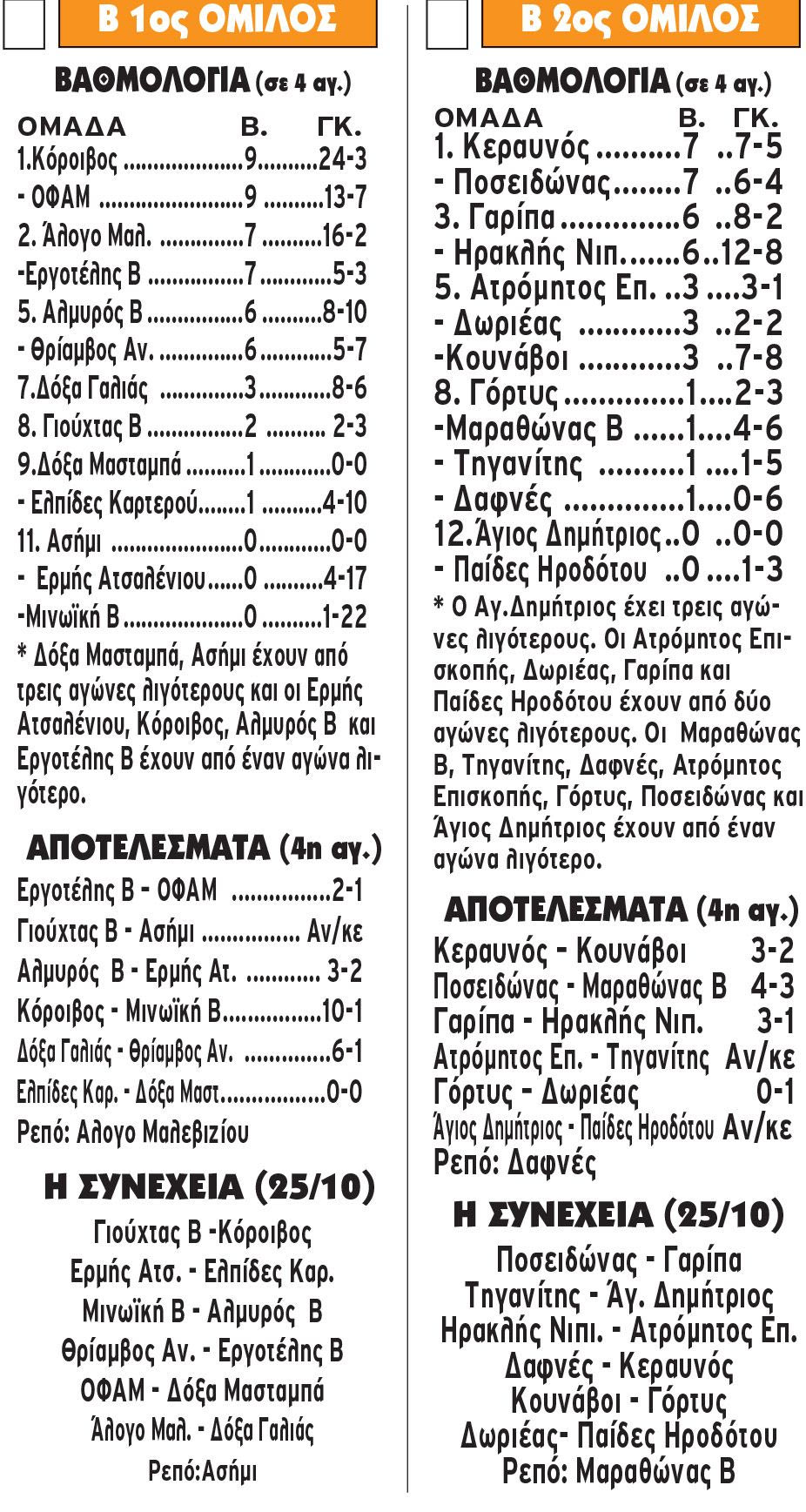 Οι γηπεδούχοι κέρδισαν στα επτά από τα εννέα ματς που έγιναν συνολικά στην Β’ κατηγορία ΕΠΣΗ την 4η αγωνιστική, όπου δεν έγιναν πάλι τρεις αγώνες (λόγω Μητρώου)! Στον πρώτο όμιλο ο Κόροιβος «έπιασε» τον ΟΦΑΜ στην κορυφή, ενώ στον δεύτερο το δίδυμο που «μοιράζεται» την… πρωτιά είναι οι Κεραυνός και Ποσειδώνας.