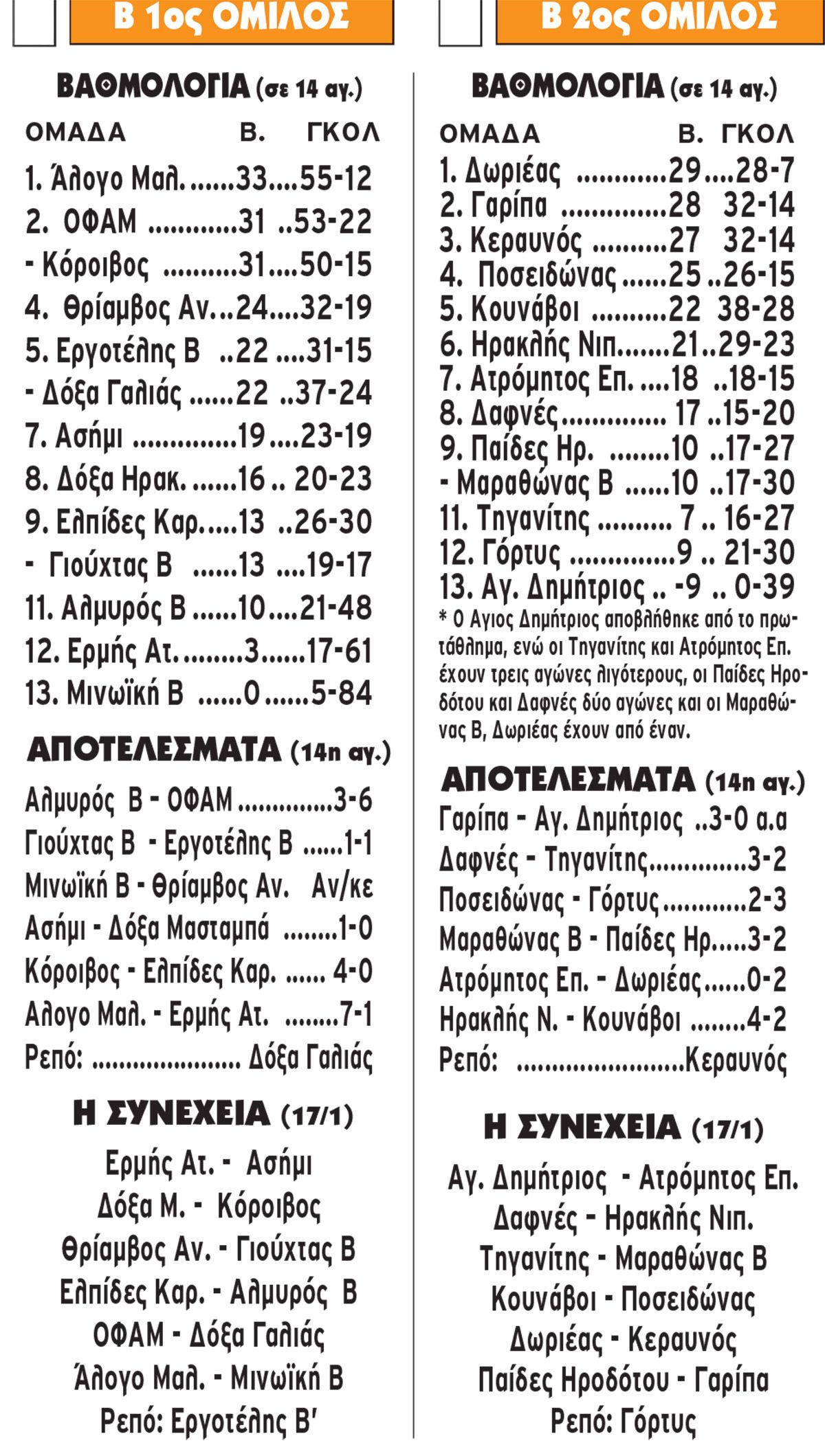 O.. «καλπασμός» του Αλόγου Μαλεβιζίου στον πρώτο όμιλο της Β ΕΠΣΗ είναι εντυπωσιακός, ενώ στον δεύτερο άλλαξε και πάλι κάτοχο η πρώτη θέση, με τον Δωριέα να βρίσκεται πλέον εκεί, μετά τους αγώνες της έναρξης του δευτέρου γύρου (14η αγωνιστική), που ήταν και η πρώτη για την νέα χρονιά.