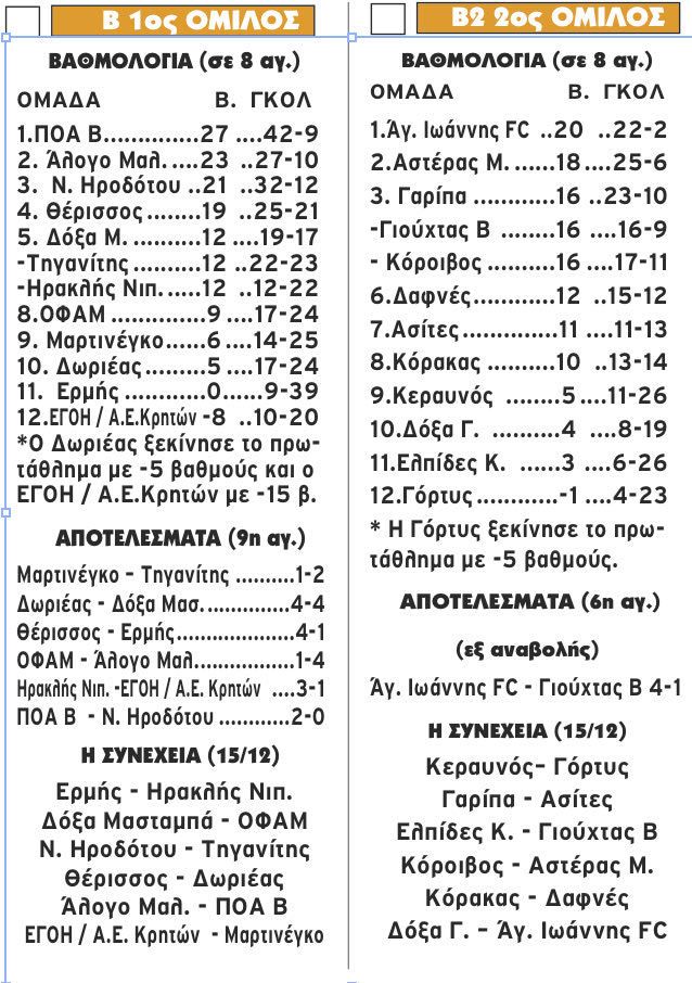 Στη Β2, διεξήχθη μόνο ο εξ αναβολής αγώνας της 6ης αγωνιστικής του Αγίου Ιωάννη FC με τον Γιούχτα Β, που είχε διακοπεί λόγω έντονης βροχόπτωσης (ενώ το σκορ ήταν 1-1).