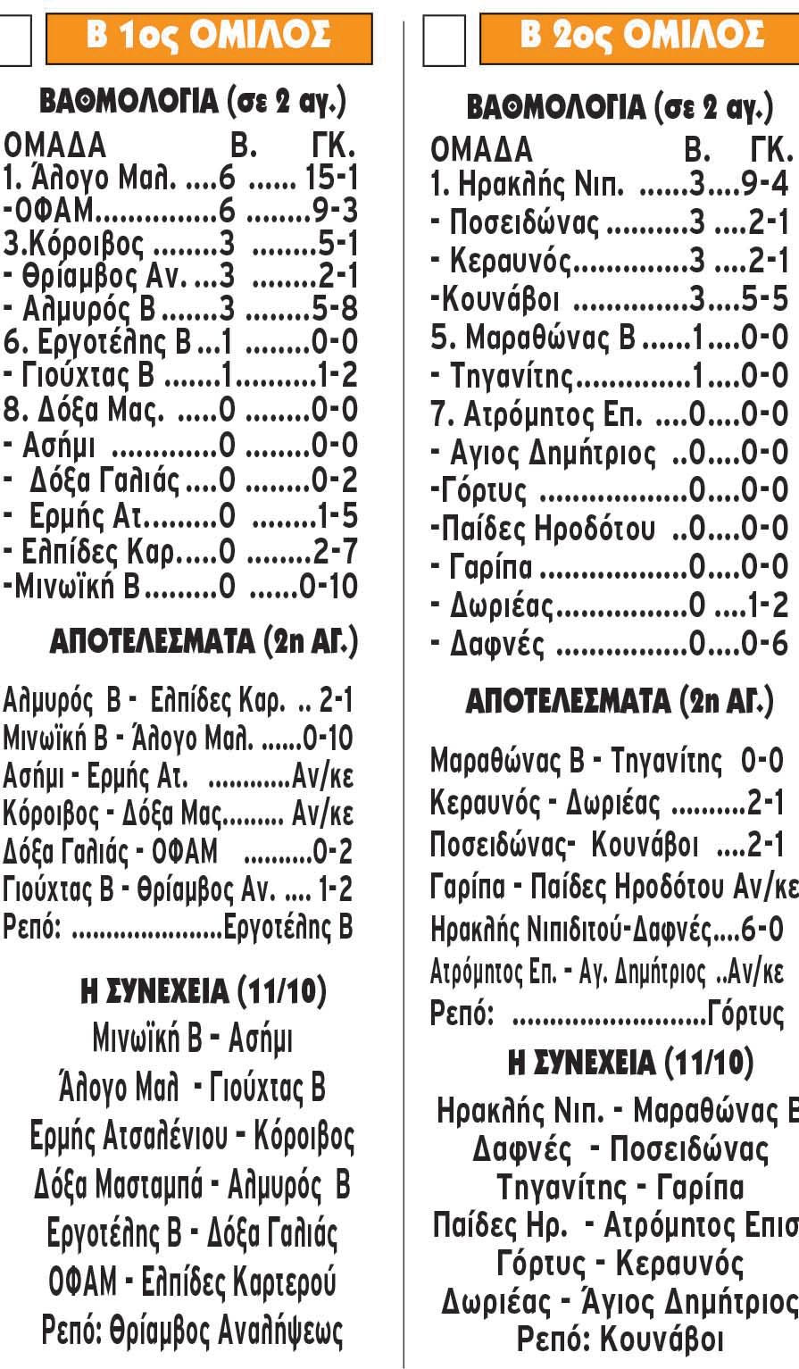 «Φωτιές» πετούσε το Άλογο Μαλεβιζίου στο γήπεδο του Πανεπιστημίου / Περιφέρειας, διαλύοντας εκτός έδρας με το εκκωφαντικό 10-0 (!) την Μινωϊκή Β., διπλασιάζοντας τις φετινές του νίκες στην δεύτερη… στροφή της Β1 ΕΠΣΗ. Το 2/2 έκανε και ο ΟΦΑΜ, κερδίζοντας με 2-0 την Δόξα Γαλιάς στην Πόμπια. «Σεφτέ» στα τρίποντα έκανε ο Αλμυρός Β’, νικώντας τις Ελπίδες Καρτερού με 2-1 στο Γάζι, όπως και ο Θρίαμβος Αναλήψεως, που πέρασε νικηφόρα με το ίδιο σκορ (2-1) από τις Αρχάνες κόντρα στον Γιούχτα Β.
