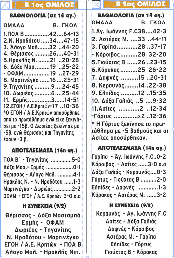 Συναρπαστικά εξελίχθηκε η αναμέτρηση ανάμεσα στο Μαρτινέγκο και τον Δωριέα (2-2). Άκοπα πήρε το τρίποντο (3-0 α.α) ο ΟΦΑΜ επί του ΕΓΟΗ / Α.Ε. Κρητών, που έχει αποσυρθεί από το πρωτάθλημα Επέκτεινε στις 9 αγωνιστικές το νικηφόρο σερί του ο πρωτοπόρος του δευτέρου ομίλου της Β κατηγορίας, Άγιος Ιωάννης FC κερδίζοντας με 2-0 τη Γαρίπα στο «Γ. Σκουρέλλου».