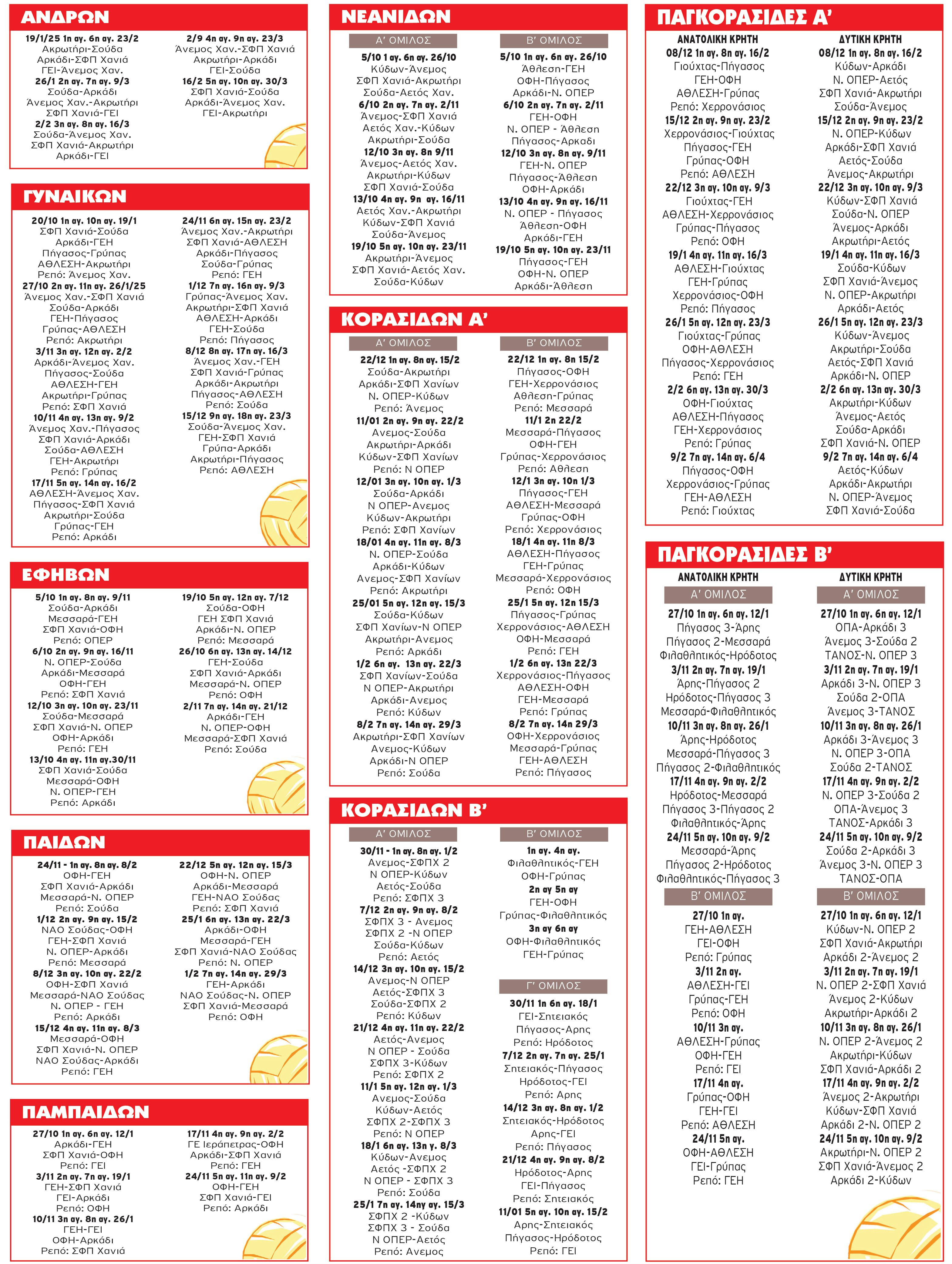 Με τη νέα χρονιά (19/1/25) θα αρχίσει το πρωτάθλημα ανδρών βόλεϊ Κρήτης, σύμφωνα με την ανακοίνωση των κληρώσεων της ΕΣΠΕΚ αλλά αυτό το γυναικών που είναι και το μεγαλύτερο σε διάρκεια θα ξεκινήσει 20 Οκτωβρίου.