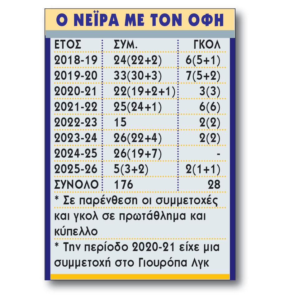 Τι κι αν βρίσκεται στα 36 του χρόνια. Τι κι αν τις τελευταίες αγωνιστικές περιόδους δεν συμπεριλαμβάνεται στις βασικές επιλογές των εκάστοτε προπονητών. Ο Χουάν Νέιρα είναι πάντα παρών, έτοιμος όποτε χρειαστεί και όποτε κληθεί για να μπει στην μάχη και να βγάλει τον…ΟΦΗ από την τρύπα.
