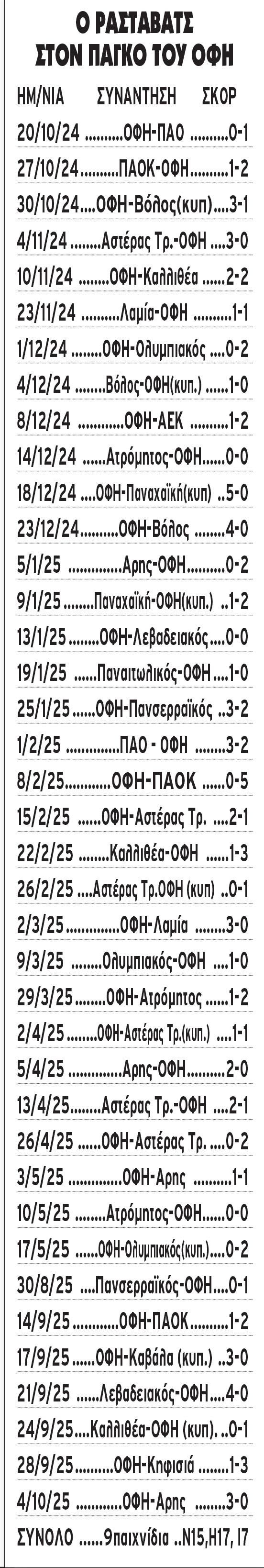 Την ερχόμενη Δευτέρα ο Μίλαν Ράσταβατςσυμπληρώνει ένα χρόνο στον πάγκο του ΟΦΗ. Ο Σέρβος προπονητής ανέλαβε πέρυσι τέτοια εποχή, αμέσως μετά την αιφνιδιαστική αποχώρηση για προσωπικούς λόγους του Τραιανού Δέλλα και μετράει ήδη 39 παιχνίδια στην τεχνική ηγεσία. Το διάστημα που πέρασε κυρίως μετά την ήττα από την Κηφισιά ήταν το πιο δύσκολο για τον Ράσταβατς, ο οποίος για πρώτη φορά αποδοκιμάστηκε για πρώτη φορά τόσο έντονα από τον κόσμο και βρισκόταν υπό έντονη πίεση πριν από το ματς με τον Άρη. Η νίκη σε αυτό το παιχνίδι λειτούργησε ως καταπραυντικό για την ομάδα αλλά και για τον ίδιο τον κόουτς ο οποίος κέρδισε χρόνο και ηρεμία για να δουλέψει και να αντιστρέψει μαζί με τους παίκτες του το κλίμα.