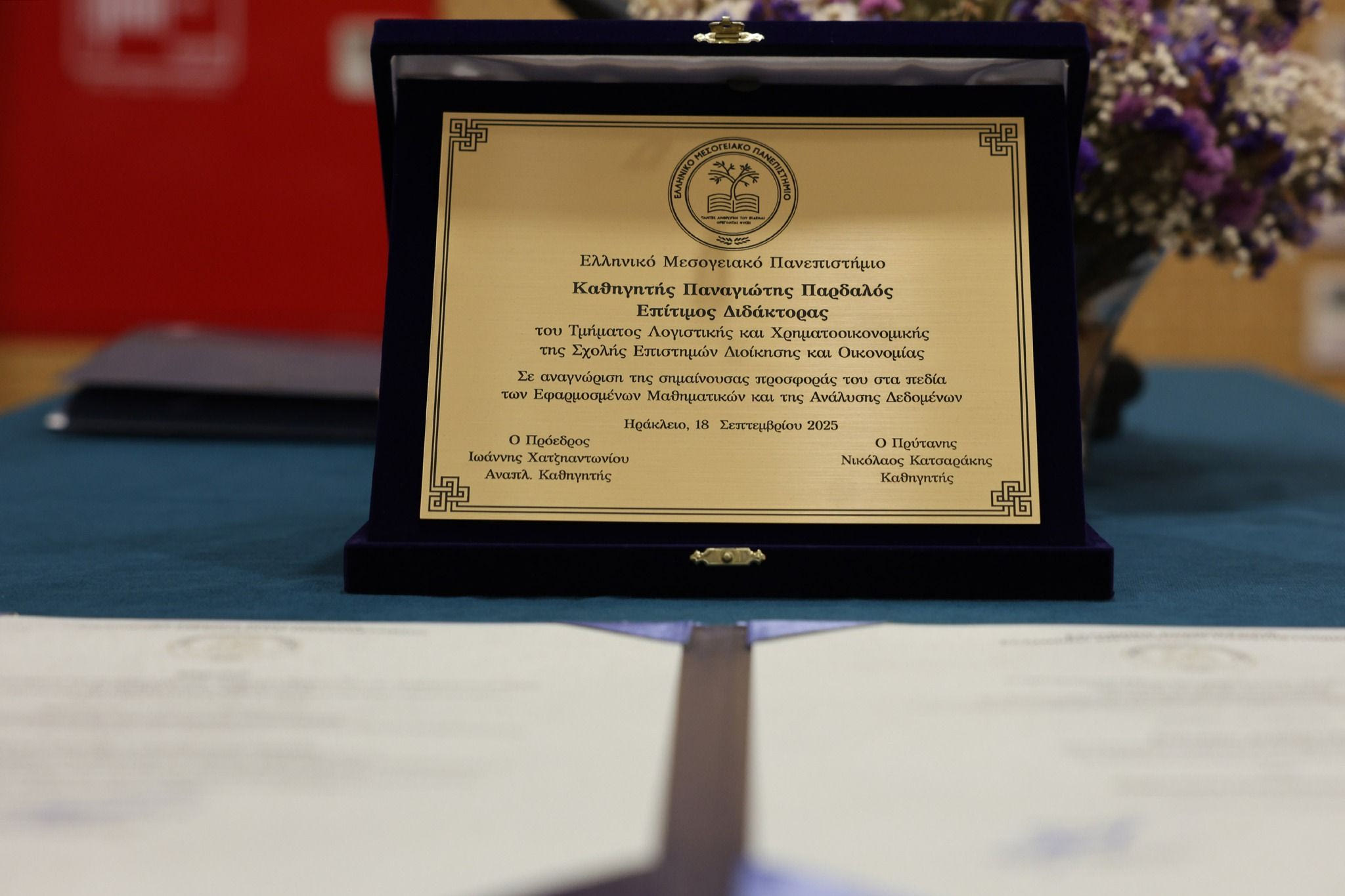Με ιδιαίτερη επισημότητα πραγματοποιήθηκε την Πέμπτη 18 Σεπτεμβρίου 2025, στο Αμφιθέατρο Εκδηλώσεων της Σχολής Επιστημών Υγείας του Ελληνικού Μεσογειακού Πανεπιστημίου (ΕΛΜΕΠΑ), η τελετή αναγόρευσης του διεθνούς φήμης Καθηγητή Παναγιώτη (Πάνου) Παρδαλού σε Επίτιμο Διδάκτορα του Τμήματος Λογιστικής και Χρηματοοικονομικής (https://accfin.hmu.gr/) της Σχολής Επιστημών Διοίκησης και Οικονομίας.