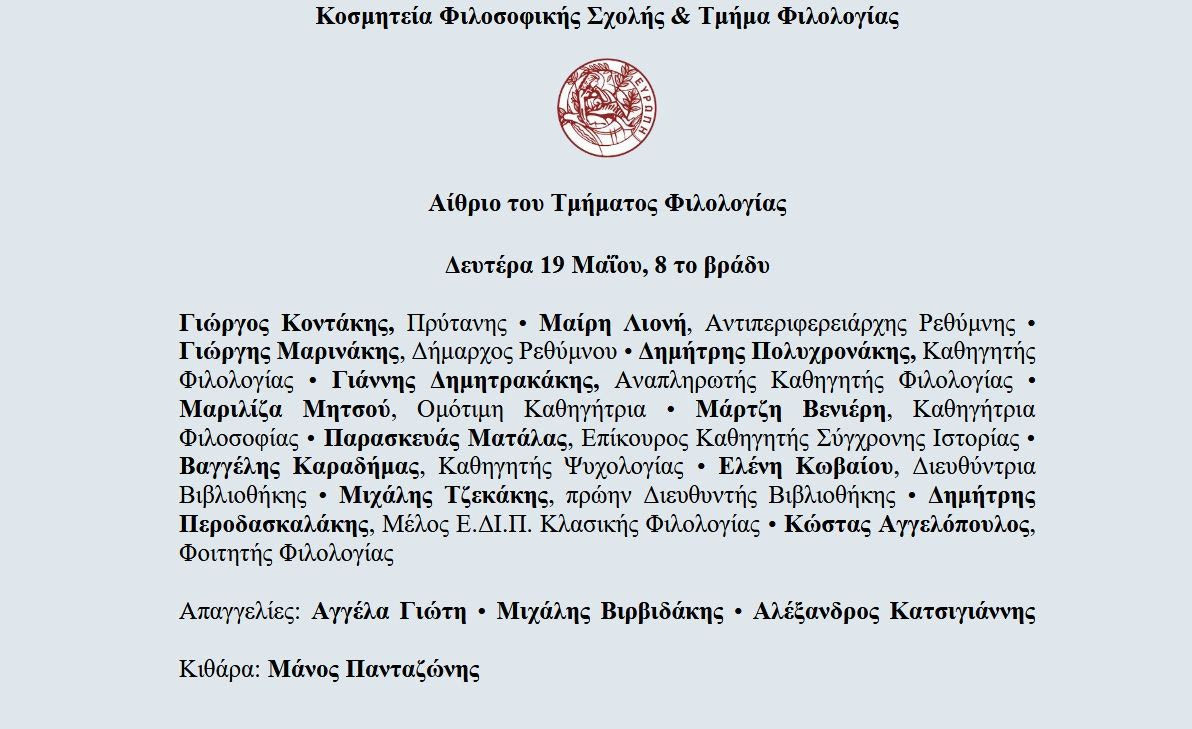 Η εκδήλωση θα πραγματοποιηθεί στο Αίθριο του Τμήματος Φιλολογίας.