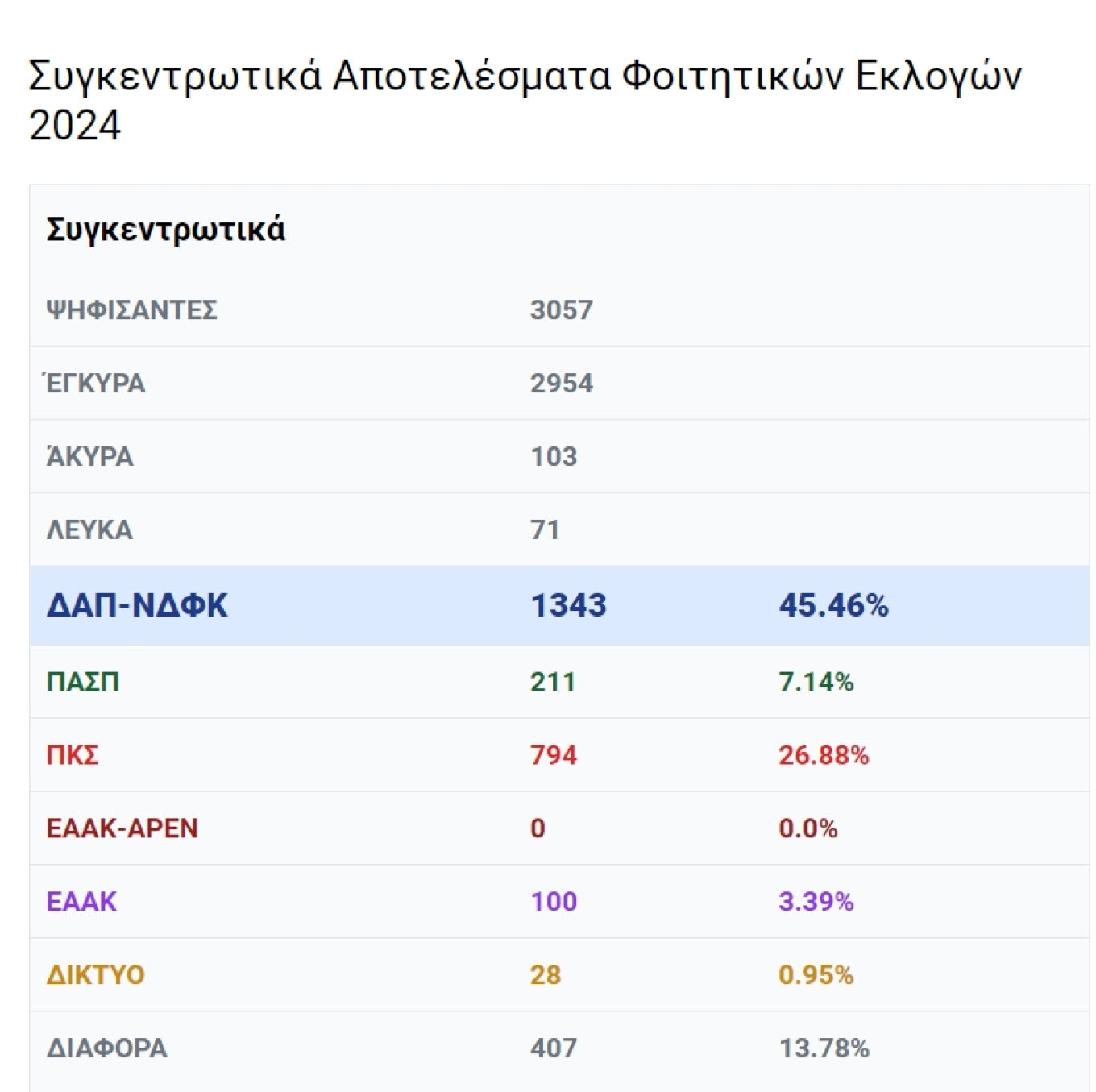 Σύμφωνα με τα πρώτα συγκεντρωτικά αποτελέσματα που ανακοίνωσε η ΔΑΠ-ΝΔΦΚ το ποσοστό που συγκεντρώνει φθάνει το 45,46%. Ακολουθεί η Πανσπουδαστική (ΚΚΕ) με 26,88%, η ΠΑΣΠ με 7,14% και η ΕΑΑΚ – που έχει την υποστήριξη του ΜέΡΑ25 και της ΛΑΕ – με 3.39% και το Δικτυο που πρόσκειται στη Νέα Αριστερά 0,95%. Τα διάφορα είναι στο 11.76%.