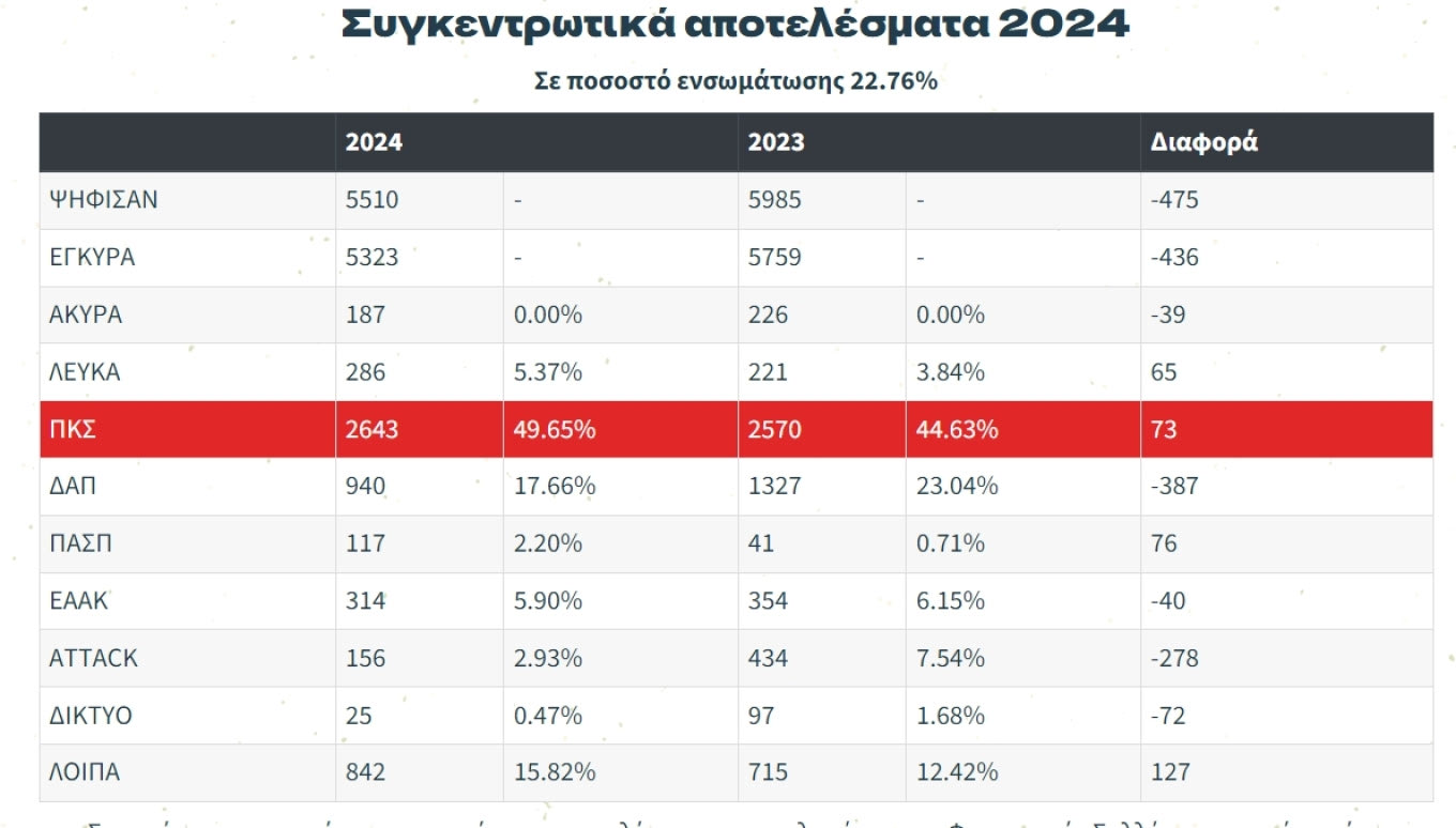 Στα αποτελέσματα που ανακοίνωσε η ΠΚΣ, σε ποσοστό ενσωμάτωσης 22.76% η Πανσπουδαστική εμφανίζεται να λαμβάνει 49.65%, η ΔΑΠ 17.66%, η ΠΑΣΠ 2.20%, η ΕΑΑΚ 5.90% η ATTACK που συγκεντρώνει σχήματα που στηρίζονται από το ΝΑΡ-ΑΝΤΑΡΣΥΑ 2.93% και το ΔΙΚΤΥΟ 0.47%