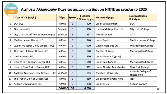 Σύμφωνα με την Εθνική Αρχή Ανώτατης Εκπαίδευσης πρόκειται για 12 συνολικά εκπαιδευτικά ιδρύματα: