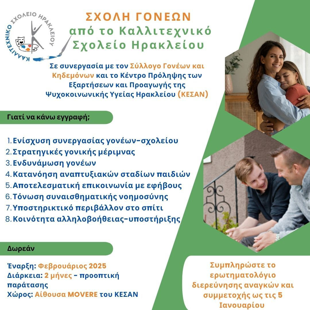 Σχολή Γονέων πρόκειται να λειτουργήσει το Καλλιτεχνικό Σχολείο Ηρακλείου, σε συνεργασία με το Σύλλογο Γονέων και Κηδεμόνων και το Κέντρο Πρόληψης των Εξαρτήσεων και Προαγωγής της Ψυχοκοινωνικής Υγείας Ηρακλείου Κρήτης (ΚΕΣΑΝ).