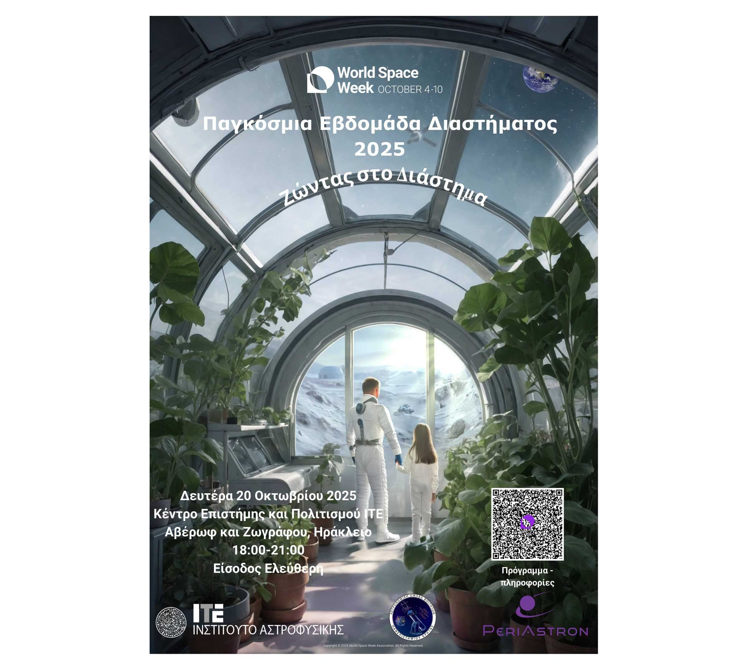 «Ζώντας στο Διάστημα – Living in Space», είναι το φετινό θέμα της Παγκόσμιας Εβδομάδας Διαστήματος και το Ινστιτούτο Αστροφυσικής του Ιδρύματος Τεχνολογίας και Έρευνας, σε συνεργασία με την Αστρονομική Ομάδα Φοιτητών Πανεπιστημίου Κρήτης και την Ομάδα Επικοινωνίας της Επιστήμης «Περίαστρον», θα πραγματοποιήσουν δράσεις, που εστιάζουν στη ζωή των αστροναυτών, έχοντας παράλληλα και το βλέμμα σε εξωτικούς πλανήτες!