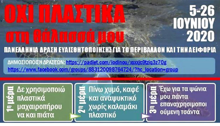 «Όχι πλαστικά στη θάλασσά μου» είναι το μήνυμα της πανελλήνιας περιβαλλοντικής δράσης που υποστηρίζεται από 27 υπεύθυνους/ες Περιβαλλοντικής Εκπαίδευσης και Σχολικών Δραστηριοτήτων, από όλη την επικράτεια, που ενώνουν δυνάμεις και στέλνουν ένα ηχηρό μήνυμα-πρόκληση σε εκπαιδευτικούς, μαθητές, γονείς και τοπική κοινωνία λίγο πριν αρχίσουν οι καλοκαιρινές διακοπές.
