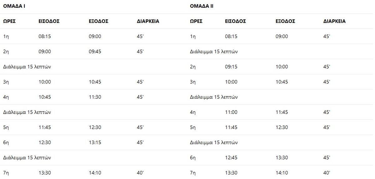 08.15 – 09.00 – 45′ 1η διδακτική ώρα