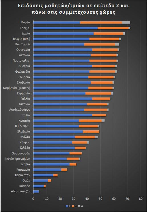 Σύμφωνα με τα αποτελέσματα της παγκόσμιας έρευνας ICILS 2023, που πραγματοποιήθηκε σε 34 χώρες, με τη συμμετοχή σχεδόν 133.000 μαθητών γυμνασίου, η Ελλάδα απέχει αισθητά από τον μέσο όρο, σε ό,τι αφορά τον εγγραματισμό στην πληροφορική και τους υπολογιστές.