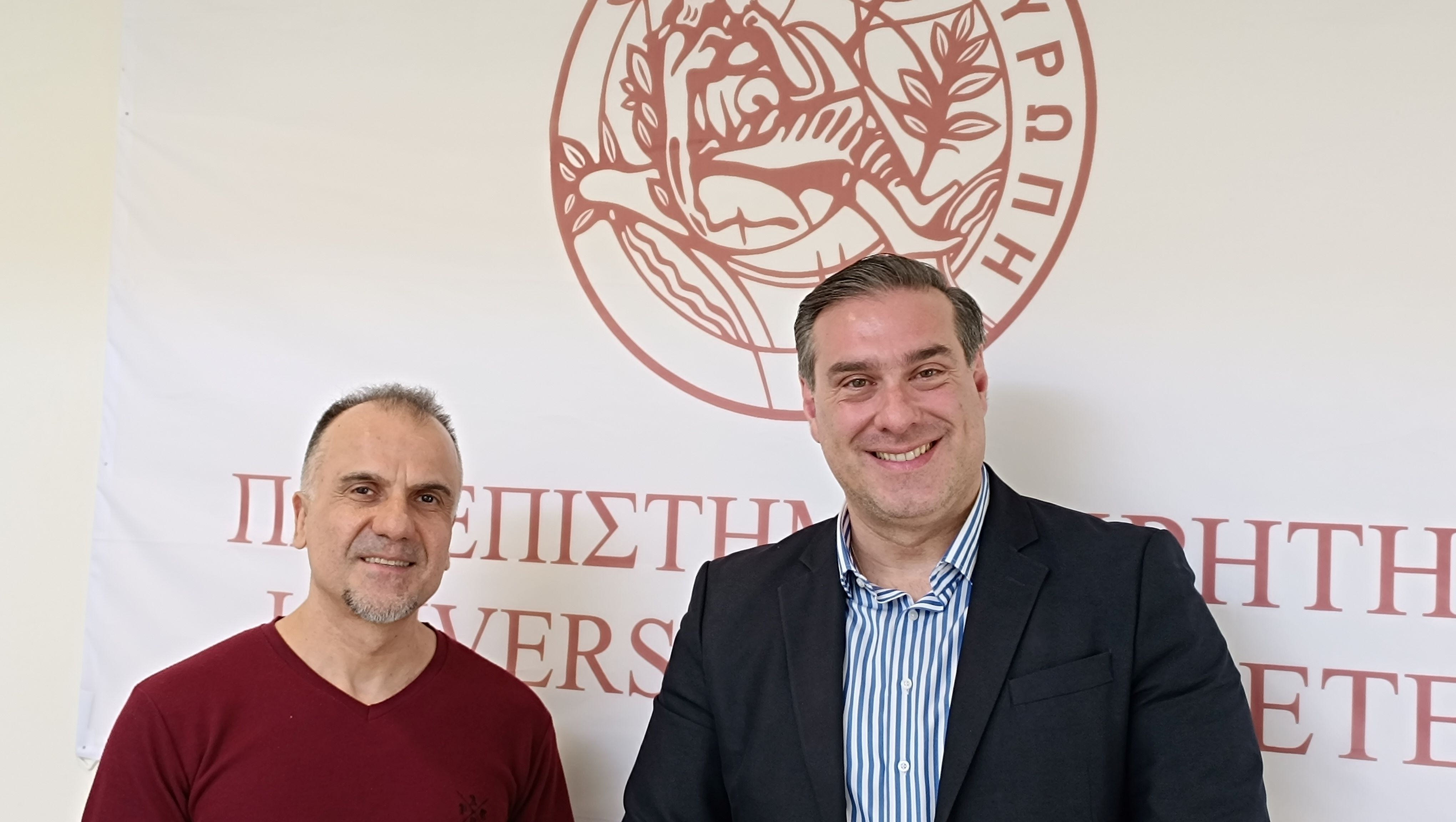 Τις δυνατότητες ενίσχυσης της διασύνδεσης της Σχολής Θετικών και Τεχνολογικών Επιστημών του Πανεπιστημίου Κρήτης με τους φορείς του νησιού και την περαιτέρω ανάπτυξη της συνεργασίας με την Περιφέρεια Κρήτης, συζήτησε ο Αντιπεριφερειάρχης Διασύνδεσης με Ερευνητικά και Ακαδημαϊκά Ιδρύματα Γιώργος Ματαλλιωτάκης με τον κοσμήτορα της Σχολής Αντώνη Σαββίδη και τον πρόεδρο του Τμήματος Χημείας Γιώργο Βασιλικογιαννάκη, κατά τη διάρκεια συναντήσεων που είχε μαζί τους στην Πανεπιστημιούπολη Βουτών.