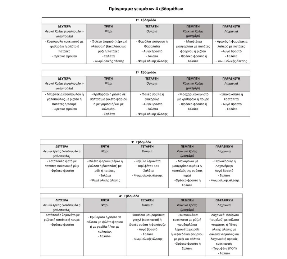Το μενού του προγράμματος αφορά και στις πέντε (5) εκπαιδευτικές ημέρες της εβδομάδας για να καλύψει τις διατροφικές ανάγκες των μαθητών/τριών, στo πλαίσιο της υγιεινής μεσογειακής διατροφής.