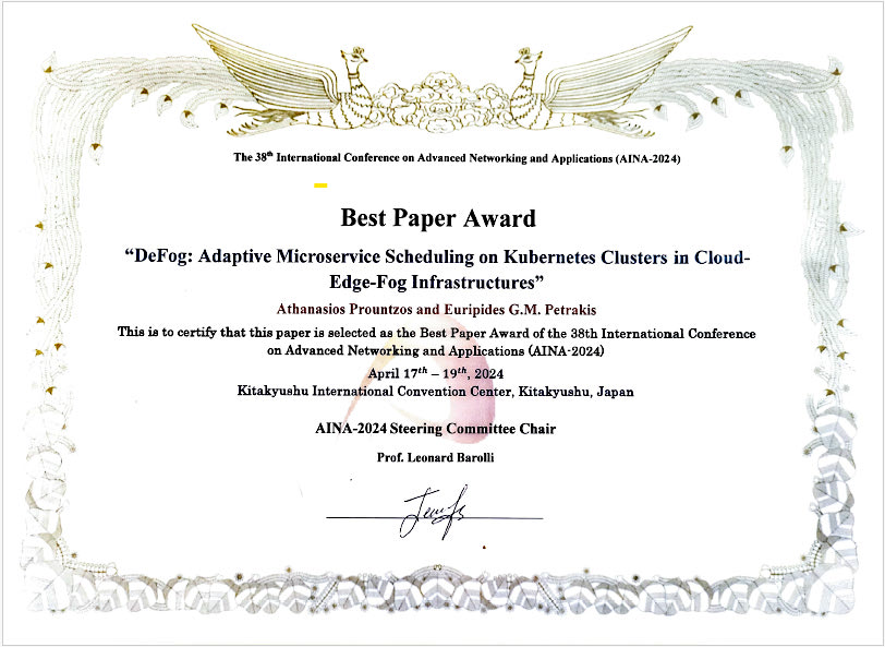 Ο καθηγητής Ευριπίδης Πετράκης της Σχολής Ηλεκτρολόγων Μηχανικών και Μηχανικών Υπολογιστών του Πολυτεχνείου Κρήτης τιμήθηκε με το «Βραβείο Καλύτερης Εργασίας – Βest paper award» στο 38th International Conference on Advanced Information Networking and Applications (AINA-2024), που πραγματοποιήθηκε στο Kitakyushu της Ιαπωνίας από 17 έως 19 Απριλίου 2024.