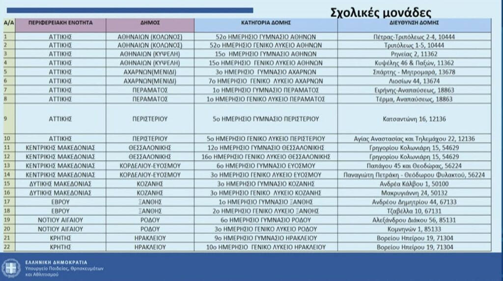 Οι 11 περιοχές που επελέγησαν είναι: Κολωνός και Κυψέλη, Μενίδι, Πέραμα, Περιστέρι, Κορδελιό, Κοζάνη, Ξάνθη, Ρόδος και Ηράκλειο Κρήτης, ενώ στόχος είναι τα 6 πρώτα σχολεία να είναι έτοιμα στην έναρξη της επόμενης σχολικής χρονιάς και τα υπόλοιπα να έχουν ολοκληρωθεί έως το τέλος του 18μηνου, δηλαδή τον Σεπτέμβριο του 2026.