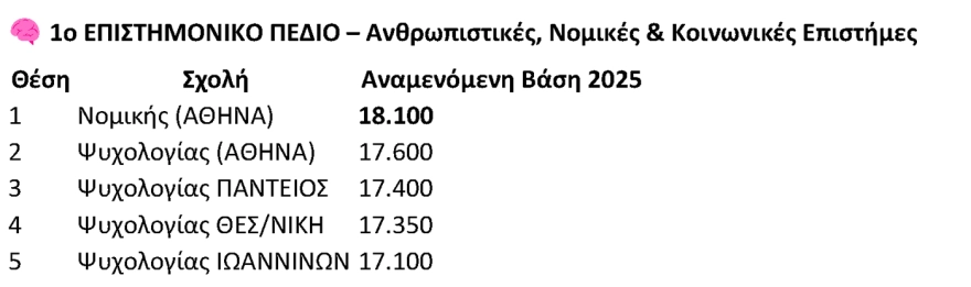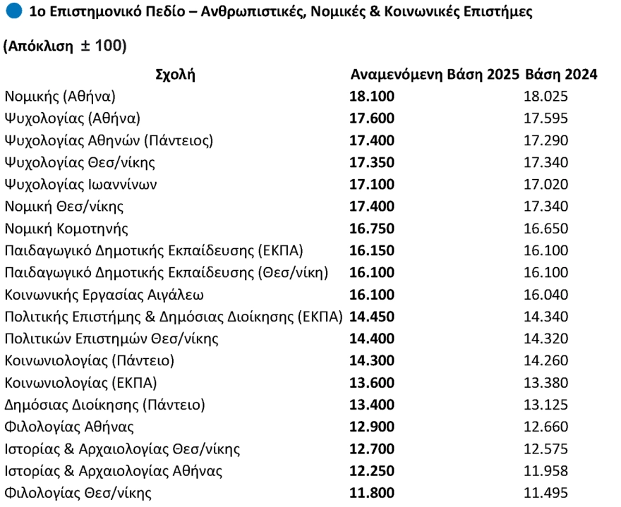 Σταθερά στην κορυφή βρίσκεται η Νομική Αθηνών, με βάση 18.100. Ακολουθούν οι σχολές Ψυχολογίας, οι οποίες διατηρούν υψηλές βάσεις (17.100 – 17.600). Κάτω των 14.500 μορίων, παραμένουν οι Φιλολογίες και Κοινωνιολογίες.